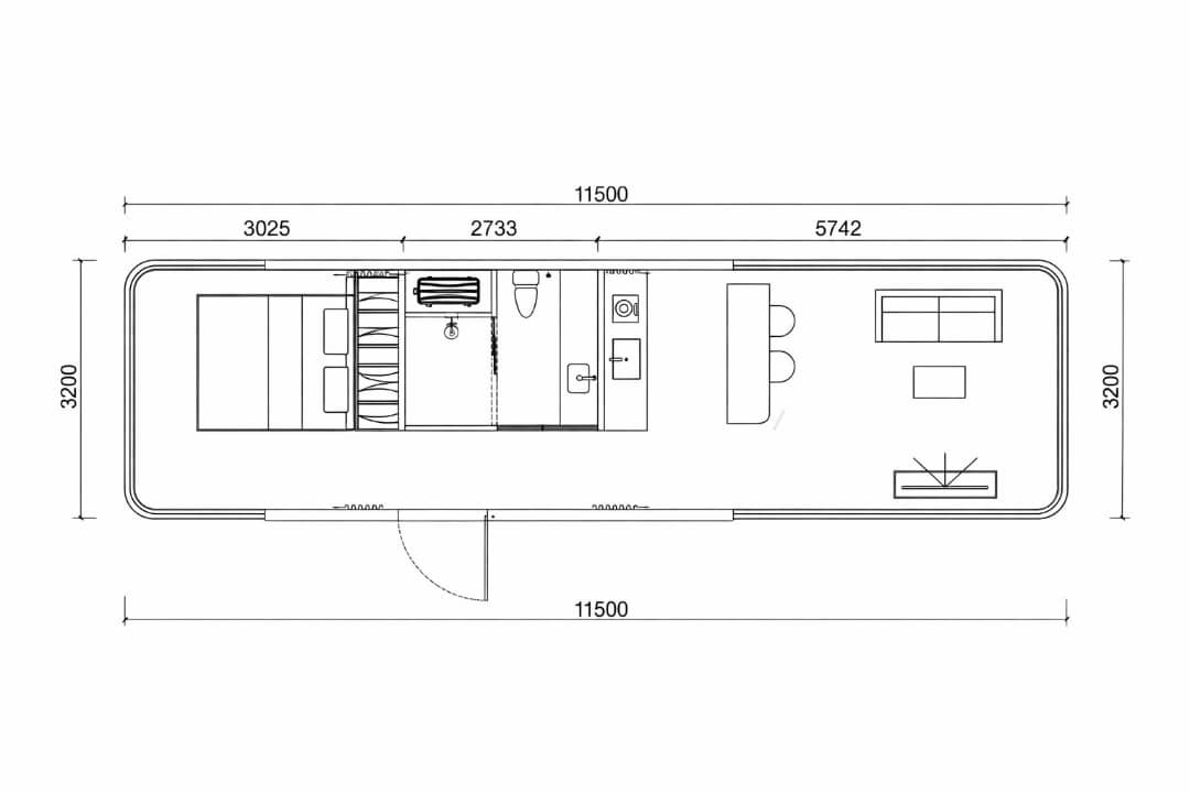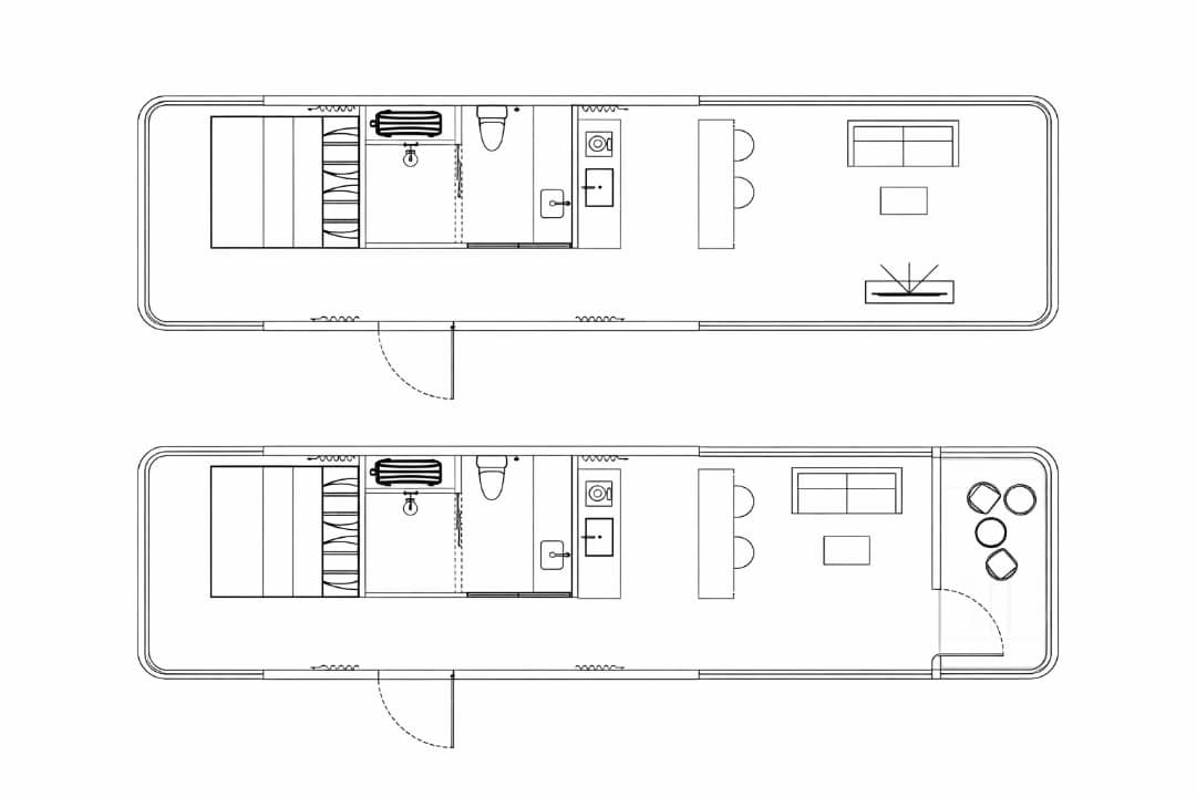 The E8 model without balcony keeps the original interior layout while removing the balcony area to provide additional indoor living space. This design allows the front section of the cabin to be used flexibly as a kitchen and living area or as a master bedroom, depending on your personal requirements.